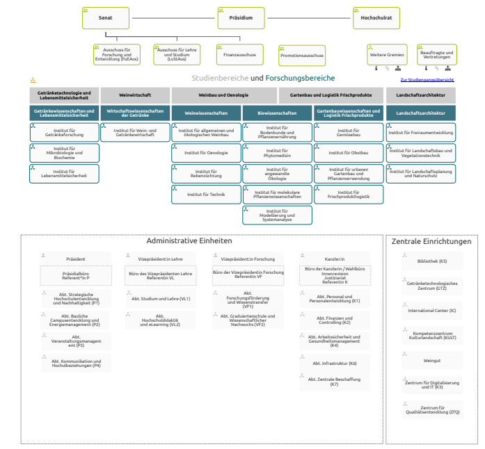 Durch das Wachstum unserer Hochschule, die Erweiterung unseres Studienangebots und der Forschungsaktivitäten ist auch eine komplette Überarbeitung unseres Organigramms notwendig geworden.Das Organigramm wurde am 21. März 2018 vom Präsidium der Hochschule Geisenheim nach intensiven Diskussionen im Senat verabschiedet und tritt mit Wirkung zum 09. Mai 2018 in Kraft.