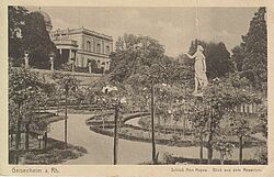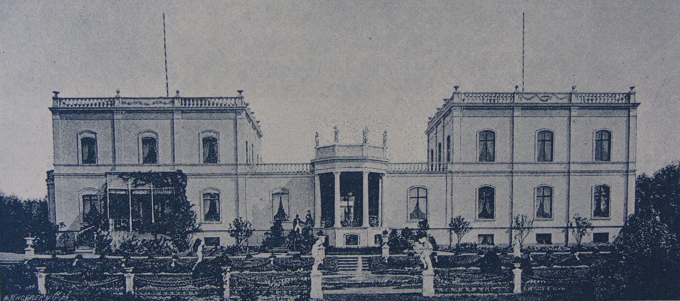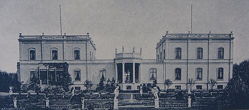 Zu Beginn der 1860er Jahre kam Lade in seine Heimatstadt Geisenheim zurück. Am Westrand der Stadt ließ er sich eine ansehnliche Villa errichten, welche jedoch zunächst nur aus dem heutigen Westflügel bestand. Lade gab seinem Anwesen den Namen „Monrepos“ (Meine Ruhe) und zog damit symbolisch einen Schlussstrich unter seine aufreibende berufliche Tätigkeit. Erst im Jahr 1873 ließ er den Bau in die heutige, schlossartige Form bringen. Von Anfang an gehörte zur Villa eine weitläufige Garten- und Parkanalage, bei deren Planung Lade von internationalen Fachleuten unterstützt wurde.