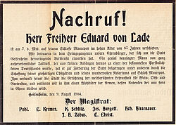 Später kam die Familie nach Wiesbaden und ihr entstammten vor allem Beamte, Pfarrer, Ärzte sowie Apotheker. Um das Jahr 1812 zog Friedrich August Lade – Eduards Vater – nach Geisenheim, wo die Familie zunächst im Ostflügel des ehemaligen Palais Ostein wohnte und dort gemeinsam mit der Familie Dresel eine renommierte Weinhandlung betrieb.