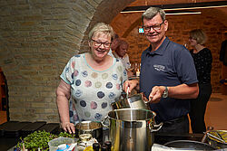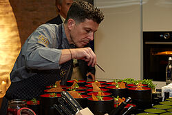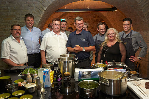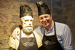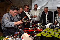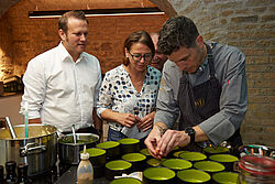 Als Überaschungsgast angekündigt war Kochlegende Harald Wohlfarth, der mit seiner Frau anreiste. Im Geisenheimer Unikeller (www.uni-keller.de) hatten an diesem Abend jedoch andere die kulinarische Verantwortung. Die Küchenmeister Janko Hilliges und Carsten Essen (CHEF2CHEF Manager) zauberten gemeinsam mit den Gästen ein köstliches Viergangmenü.