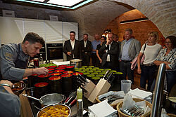 Der parlamentarische Staatssekretär bei der Bundesministerin für Ernährung und Landwirtschaft Hans-Joachim Fuchtel MdB, Kochlegende Harald Wohlfarth (25 Jahre 3 Sterne – kein anderer deutscher Koch erhielt die Höchstauszeichnung des Guide Michelins über einen so langen Zeitraum) und Turnerlegende Eberhard Gienger (Welt- und Europameister, Bronze bei Olympischen Spielen) zu Gast im Geisenheimer Unikeller.