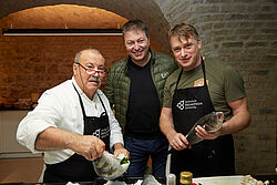 Jörg Boberg, der Luigi Brunetti bei der Winzer-Euro 2016 im Rheingau kennenlernte, initiierte den Genuss-Abend, um Gästen aus Wissenschaft, Wirtschaft, Politik und Verbänden die hohe Qualität der Waren zu präsentieren. Gemeinsam mit Luigi Brunetti verarbeiteter er Wolfsbarsch in Meersalzkruste, Jakobsmuscheln und Tunfischsteaks. Risotto mit weißem Trüffel, Salatvariationen und Desserts rundeten den kulinarischen Abend ab.