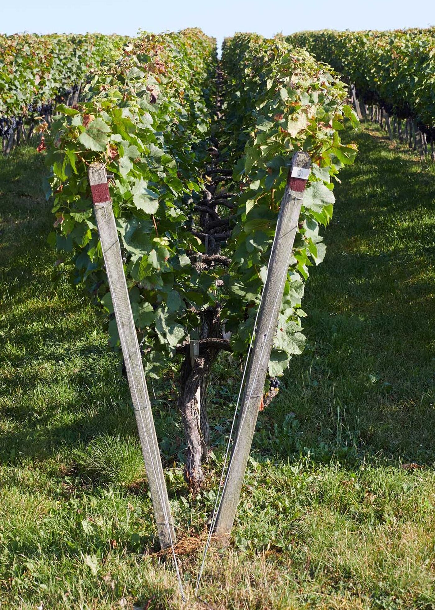Die Laubwand eines Weinbergs kann man getrost als Kraftwerk bezeichnen. Einmal voll entwickelt produzieren die Blätter durch die Photosynthese Kohlenhydrate, fixieren Energie und setzen Sauerstoff frei. Für den Winzer steht die Einlagerung von Zucker in die Trauben im Vordergrund. Wie so oft im Leben spielt die Optimierung des Verhältnisses von In- und Output eine wichtige Rolle. Wenn man sich nun um die Gestaltung der Laubwand und damit dem sogenannten Erziehungssystem der Rebe Gedanken macht, kommt es darauf an, wieviel Energie pro Fläche Laubwand aufgenommen werden kann, um eine bestimmte Menge an Trauben optimal zu versorgen. Dieses Zusammenspiel drückt sich im Blatt-Frucht Verhältnis aus und kann durch den Winzer beeinflusst werden, in dem er die Laubwandarchitektur unterschiedlich gestaltet.