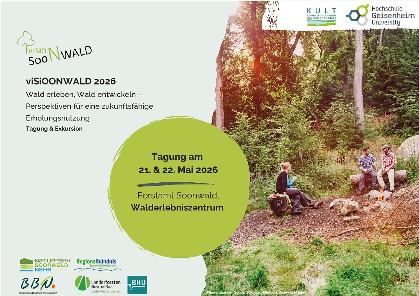 Am 21.–22. Mai 2026 findet im Walderlebniszentrum (Forstamt Soonwald) die viSiOONWALD Frühjahrstagung 2026 mit dem Thema „Wald erleben, Wald entwickeln – Perspektiven für eine zukunftsfähige Erholungsnutzung“ statt