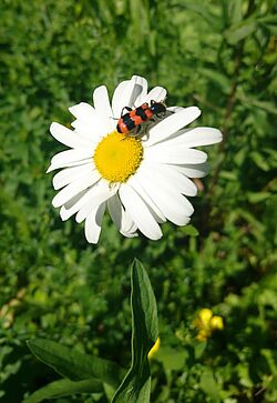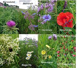Sie werden von Honigbienen, Wildbienen und Käfern besucht. Die Völker entwickeln sich gut, die Bienen sind rege beschäftigt um die Brut zu versorgen und Nektar heran zu tragen. Doch wo noch finden unsere Bienen Nektar und Pollen? Dazu müssen wir nicht weit gehen. Auch in den umliegenden Flächen, die zwar von Weinbau dominiert sind, finden sich Leckereien. In der Gemarkung sind nach und nach mehr Weinberge mit vielartiger Einsaat zu sehen. Das fördert Insekten aller Art und dies freut wiederum die Vögel. Es fehlt noch immer an einem größeren Netzwerk von solchen Inseln. Oftmals liegt die "Geburtsstätte" z. B. einer Wildbiene sehr weit von den Futterpflanzen entfernt. Für manche Arten mit kurzer Flugdistanz wird es immer schwerer in diesen Landschaften zu überleben. Bei meinem Streifzug konnte ich es aber doch summen und brummen hören. Das stimmt mich optimistisch.
