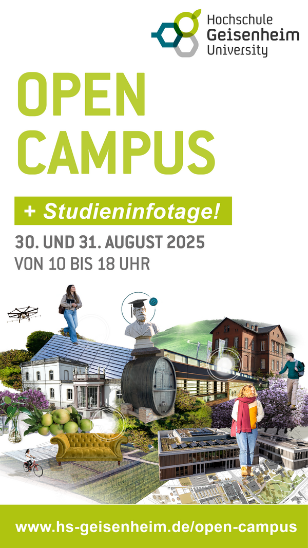 Am Samstag, 30. und Sonntag, 31. August 2025, lädt die Hochschule Geisenheim unter dem Motto „Forschung. Bildung. Praxis.“ herzlich zum Open Campus ein. An beiden Tagen haben Bürgerinnen und Bürger, Studieninteressierte, Fachleute, Alumni sowie Freundinnen und Freunde der Hochschule die Gelegenheit, angewandte Forschung sowie das praxisorientierte Studienangebot hautnah zu erleben und den einzigartigen Geisenheimer Campus mit all seinen Facetten zu entdecken.