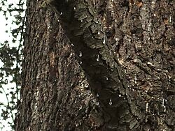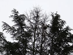 Die Atlaszeder (Cedrus atlantica; über 26 m hoch, Umfang von über 3 m, Durchmesser von über 95 cm, geschätztes Alter 120 Jahre) ist von Borkenkäfern befallen.