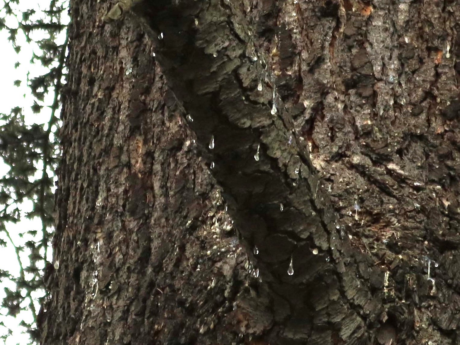 Der Befall zeigt sich schon deutlich durch Wipfeldürre (starkes Trocknen und Absterben der Krone), erheblichen Verlust von Nadeln, massiven Harzfluss und viele Ausfluglöcher der Borkenkäfer.