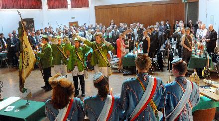 Sogar die Strahler, die sonst Disco-Licht erzeugen, werfen an diesem Abend die Farben Rot, Gold und Grün an die Wand. Das sind die Farben der Geisenheimer Studentenverbindung Rhenania, die ihr 125. Stiftungsfest im Domzentrum feiert. Im Saal bietet sich ein buntes und archaisch anmutendes Bild. Zahlreiche, meist grüne, Samtkappen sind zu sehen, und dreifarbige Bände spannen sich über den Hemdbrüsten.