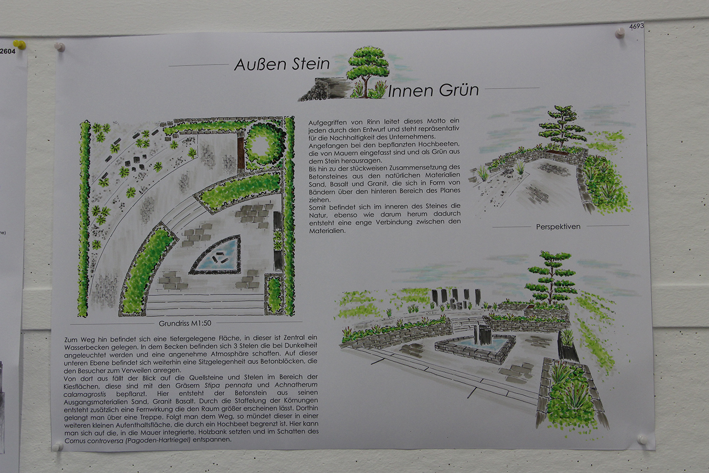 Ihren Entwurf prägen bepflanzte Hochbeete, Bänder aus den natürlichen Materialien Sand, Basalt und Granit sowie ein Wasserbecken mit Quellsteinen und beleuchteten Stelen. Ihre Idee: Sowohl im Inneren der Steine, als auch umrandend werden Pflanzen als Verbindung zwischen den Materialien genutzt. Platz 2 belegte Marie Scholtissek mit ihrer Idee eines grünen Regenwald-Zimmers, dominiert von einer bewachsenen Betonwand mit Wasserbecken und Hängesesseln zum Verweilen. Den 3. Platz teilten sich zwei von der Jury als gleichwertig beurteilte Entwürfe – „Natürlicher Kreislauf“ von Maria Vatter und Elena Simon sowie „Ökologischer Kreislauf“ von Lukas Friedel und Geraldine Bechstein.