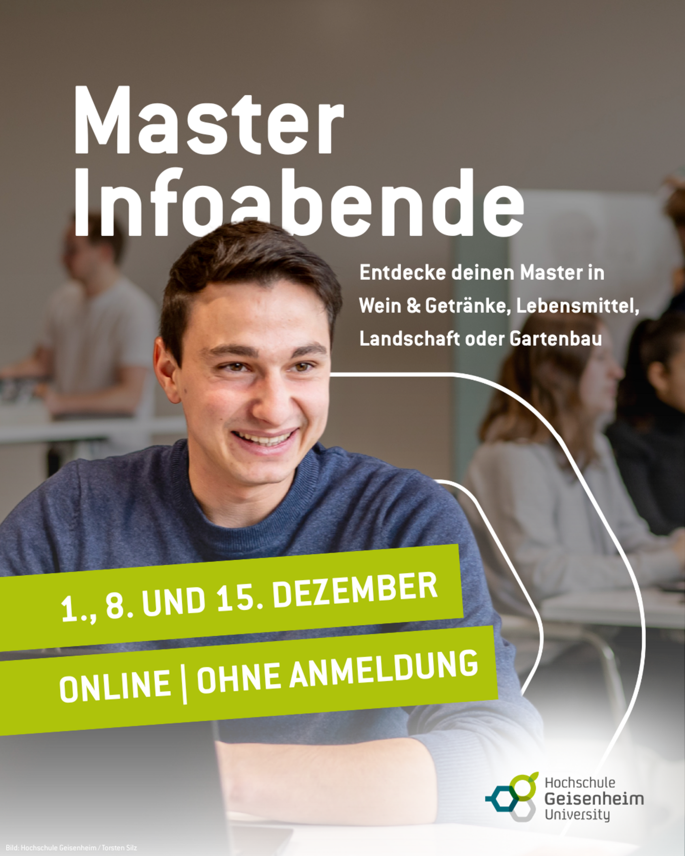 Du willst nach dem Bachelor beruflich und fachlich durchstarten? Dann informiere dich bei der Master-Info-Woche der Hochschule Geisenheim im Dezember über unsere spezialisierten Master-Studiengänge in den Bereichen Wein, Getränke, Lebensmittelsicherheit, Landschaftsarchitektur und Gartenbau.