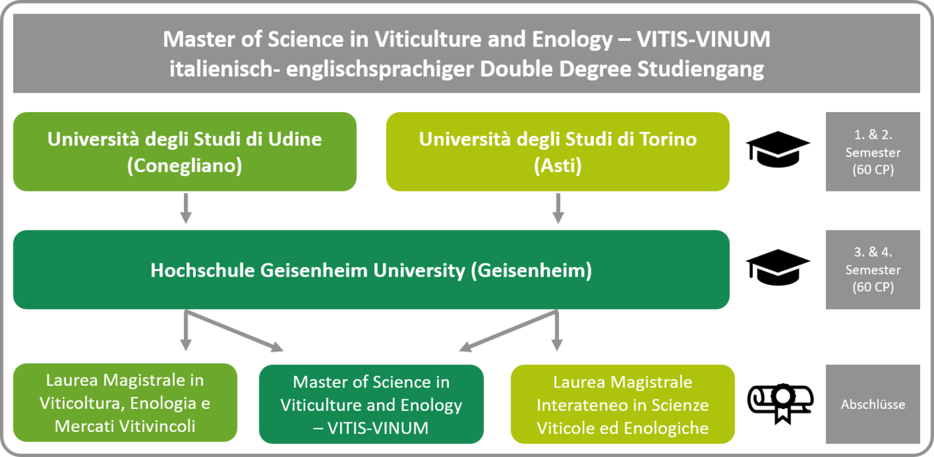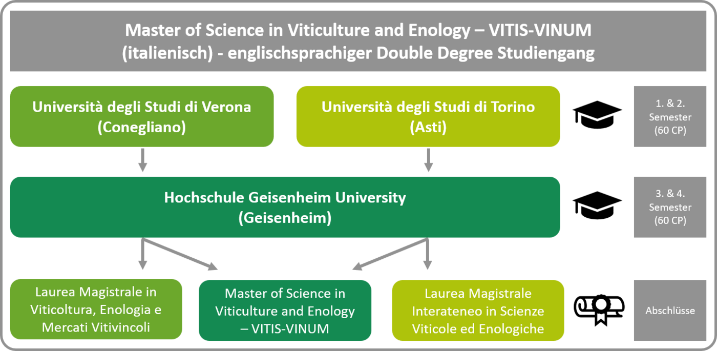 Der Double-Degree-Masterstudiengang „Viticulture and Enology – VITIS-VINUM“ wird gemeinsam von einem Konsortium der renommierten Universitäten Turin (im Verbund mit den Universitäten Mailand, Palermo, Sassari und Foggia), Verona (im Verbund mit den Universitäten Padua, Udine und Bozen) und Geisenheim durchgeführt.