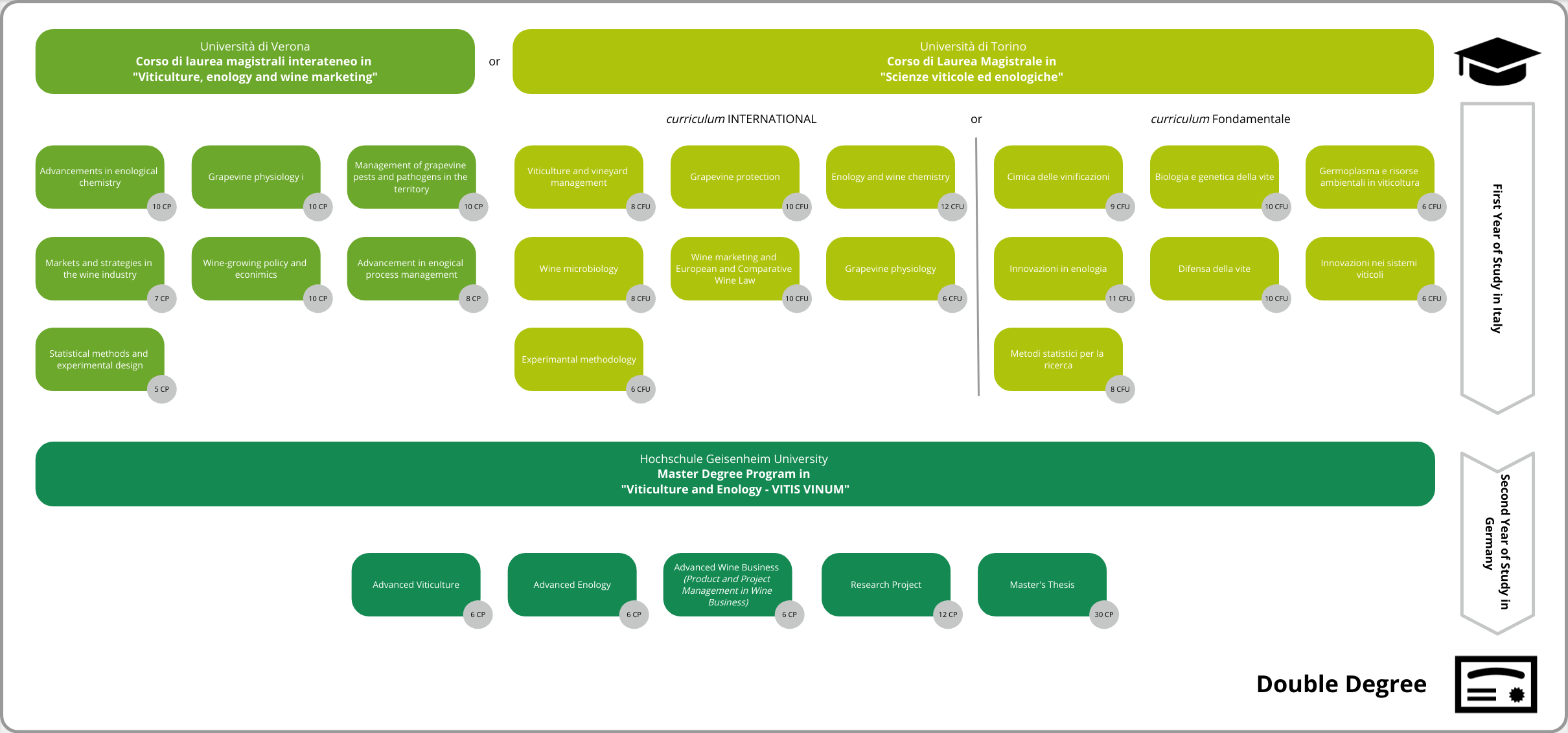 | Studienorte | 1. Studienjahr in Conegliano (Uni Udine) oder Asti (Uni Turin) und 2. Studienjahr in Geisenheim (HGU) |